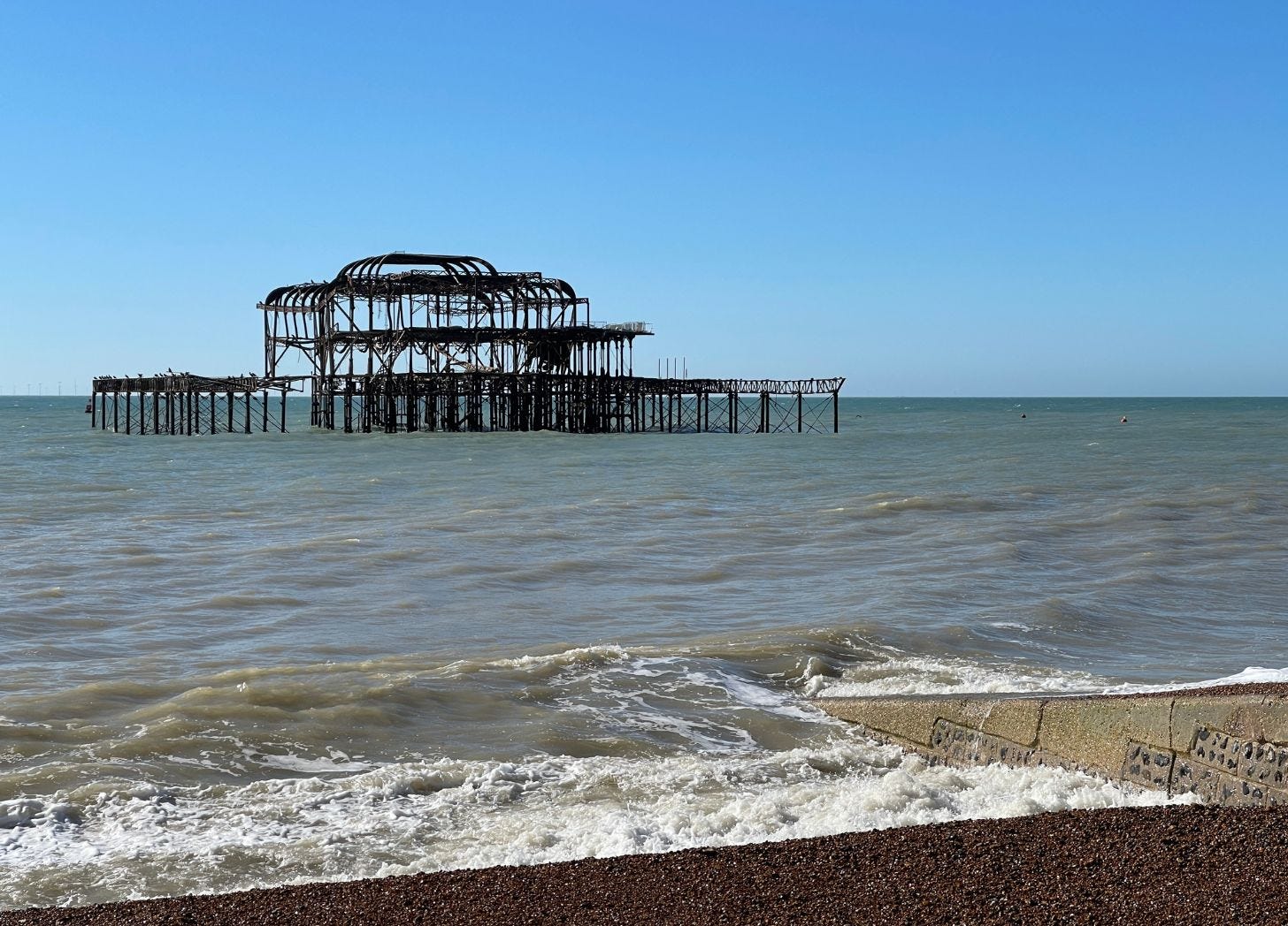 West Pier, Brighton. 10am. 13°C, sunny, moderate south-easterly wind. High tide.