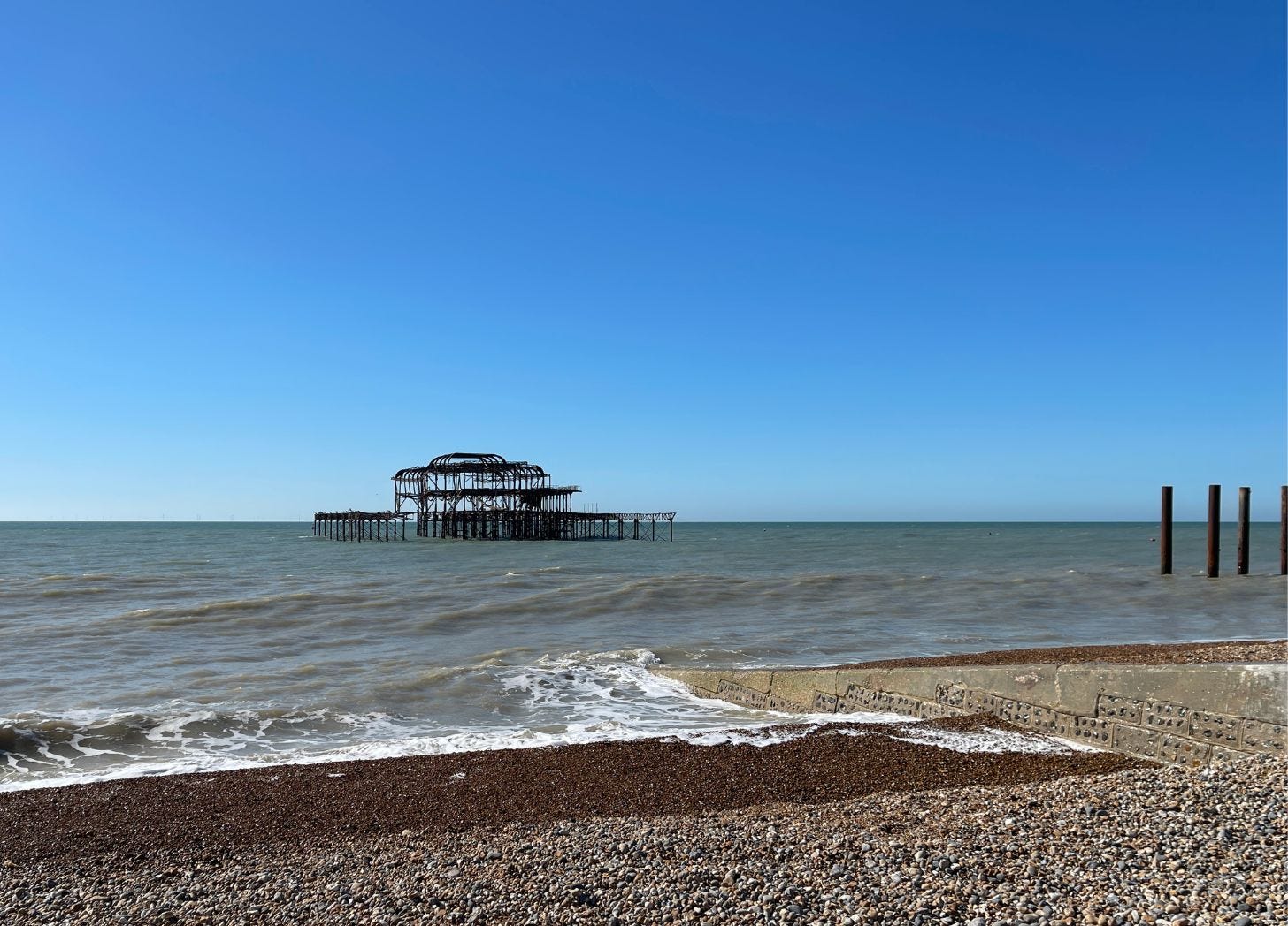 I’m on the east side of the West Pier when I stop, closer to the wreckage but held at bay by the high tide. The rusty pillars are plunged into the deeper water. Pebbles are pushed into flat levels along this stretch and offer a sturdy seat for sea gazers. Dark waves force their edges up the stones and the ripples are relentless under the east wind.