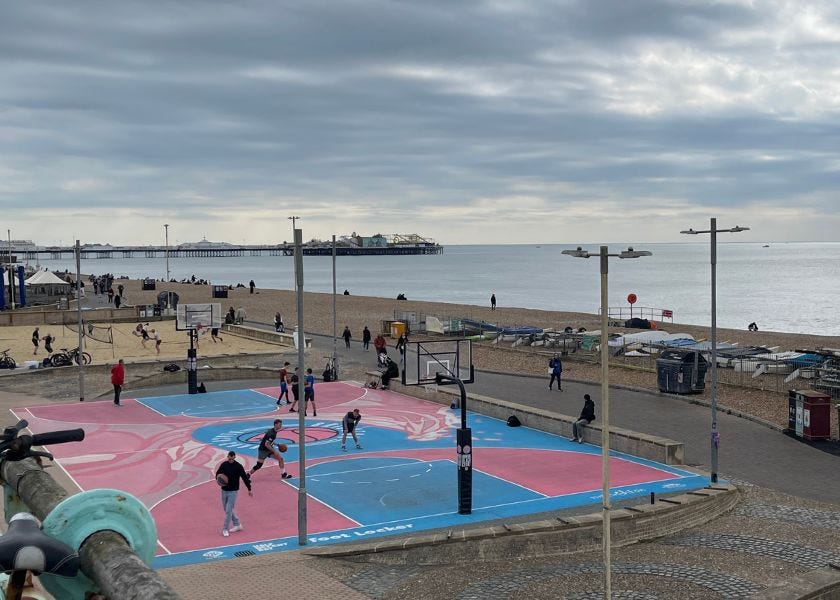 On my walk through the city centre, parents can be heard rounding up curious children. At the beach the yells and whoops from the basketball court and the volleyball game carry across the promenade. There are gatherings along the shore. I hear a man explaining about the fire that burnt down the pier.