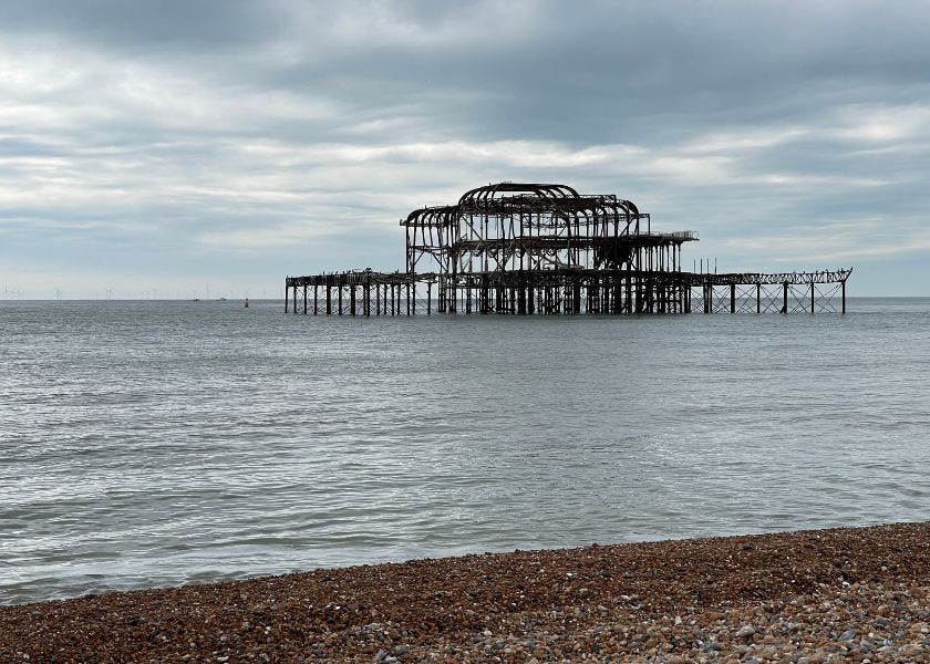 West Pier, Brighton. 11am. 13°C, cloudy, light breeze. High tide in an hour.