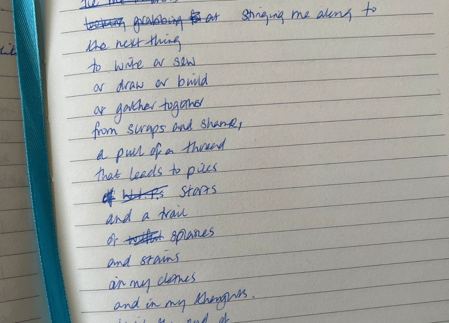 Stringing me along to the next idea to write or sew or draw or build or gather together from scraps and shame. A pull of a thread that leads to piles of starts and a trail of splashes and stains on my clothes and in my thoughts. Then the end of the line. Until the next spark lights the way.